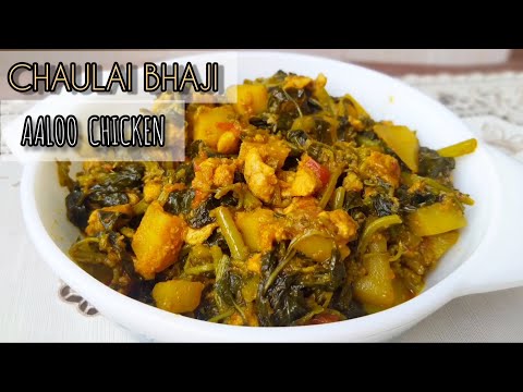 • When half of the stock dries up, add chopped amaranth leaves (chaulai bhaji), cover and let cook for another 15 minutes over medium flame.